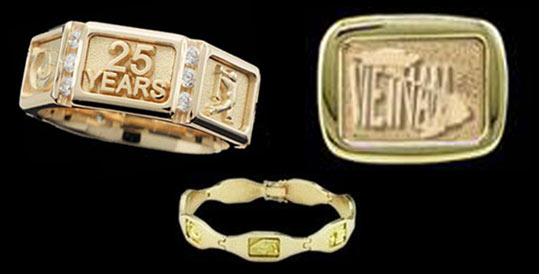 The Story Ring is a custom piece of jewelry with five or six panels containing images that collectively tell the tale of a person`s life. Images represent personal milestones, interests and achievements from a wide variety of categories including sports, family, occupations and military.